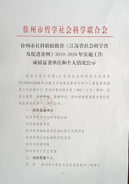 徐州市社科联拟推荐《江苏省社会科学普及促进条例》2019-2020年实施工作成绩显著单位和个人情况公示
