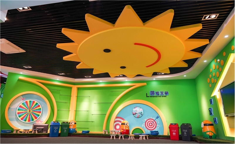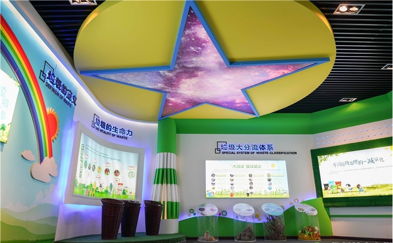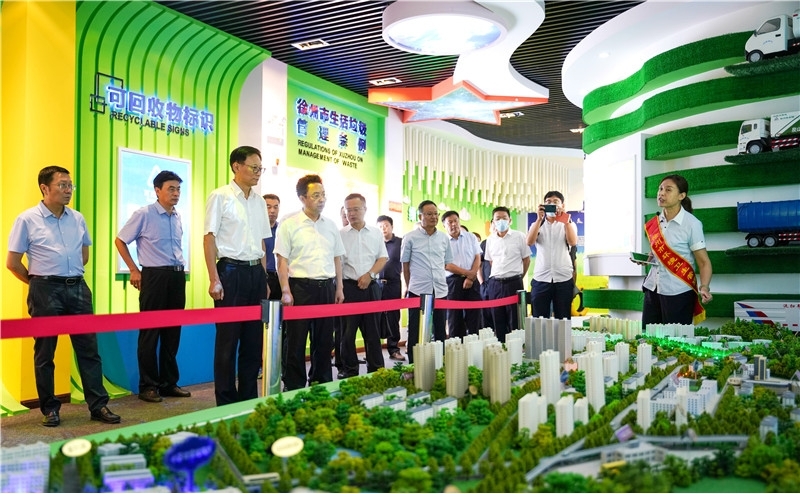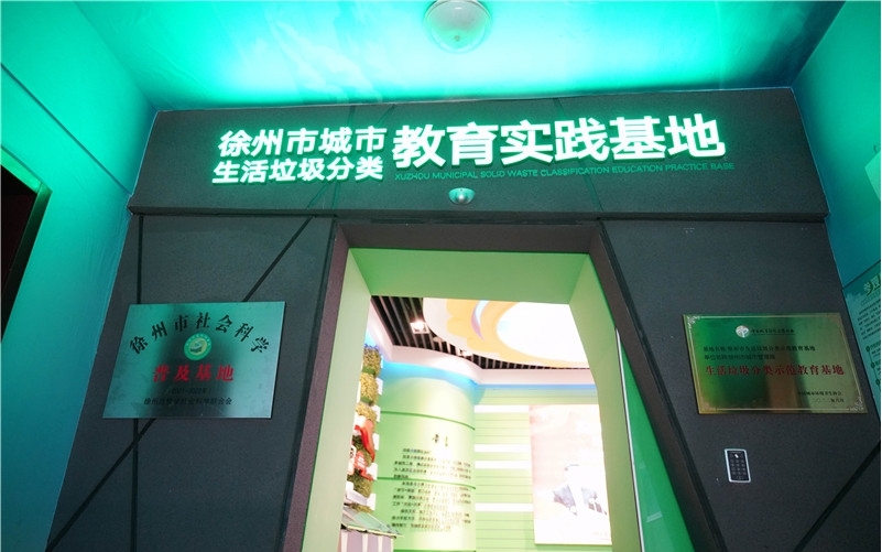 徐州市生活垃圾分类示范教育基地建筑面积480余平方米,共投入经费350余万元,位于徐州市泉山区翟山街道十里村泉山区城市管理局五楼。基地包含普法教育、分类课堂、体验互动三大区域,23个板块。普法区综合运用“学习+体验”的方式和“数字+实物”的形式,通过“垃圾是什么”“垃圾知多少”“垃圾分类收运处置体系”“垃圾分类处置工艺”“徐州市生活垃圾管理条例”“生活垃圾四分类标识”等板块,介绍垃圾分类的目的、意义和方法,充分展示我市生活垃圾分类工作的建设及管理体系。分类课堂以观看视频学习、小小讲台、知识竞答等形式开展集中交流,分享体会。体验区则设有“变废为宝”创意展览,以及飞镖转盘、触控游戏等互动答题环节,让参观者在寓教于乐中了解分类知识、掌握分类方法、促进分类习惯较快养成。