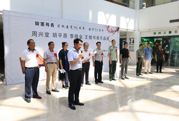 在举国欢庆中国共产党成立96周年,迎接中国人民解放军建军90周年之际,以弘扬徐州双拥精神,喜迎十九大为主题的“翰墨丹青——庆祝建党96周年建军90周年书画作品展”7月22日在徐州市图书馆开幕,展期至8月2日。徐州市社科联,市双拥办,驻徐73905部队,武警徐州消防支队,中国项目科学研究院,亚洲微电影艺术节组委会,徐州书画院,徐州演艺集团,香港、北京和徐州企业,主办单位《中国区域发展》杂志社、徐州市区域文化研究会、徐州市图书馆等单位领导及中国梦书画艺术研究院在徐领导成员和书画家,广大书画爱好者一百余人出席了开幕式并观看了展览。著名主持人、导演、制片人李传明主持开幕式。